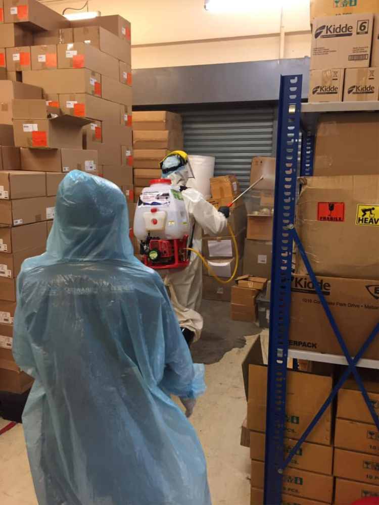 ที่เข้ามาพ่นสารฆ่าเชื้อโควิทที่สำนักงาน, คลังสินค้า และรถยนต์ที่ใช้เซอร์วิสในวันพุธที่ 1 เมษายน 2563 หนึ่งในมาตราการป้องกันของบริษัทฯ
