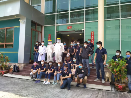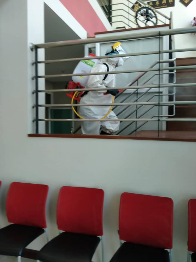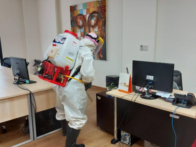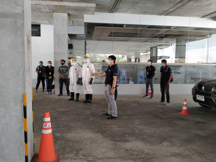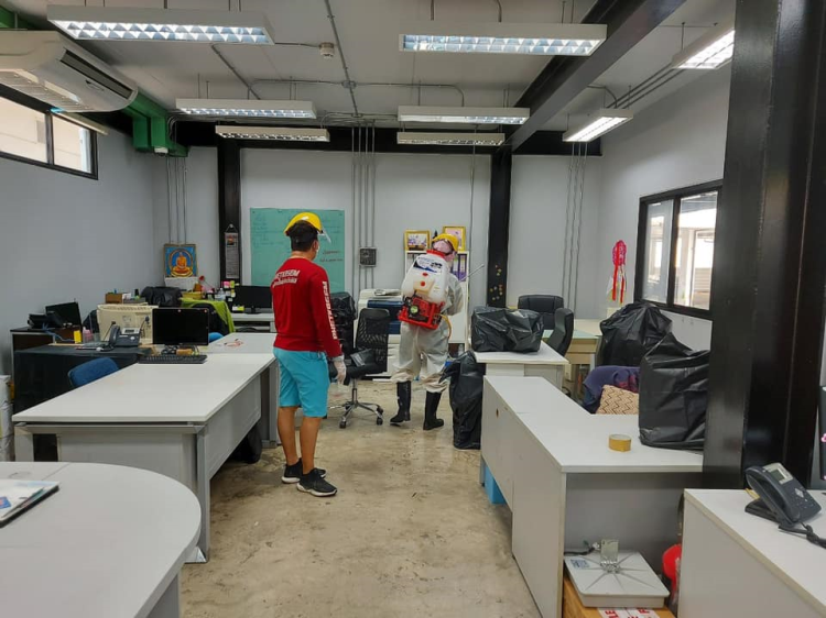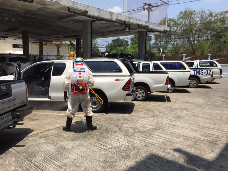 ที่เข้ามาพ่นสารฆ่าเชื้อโควิทที่สำนักงาน, คลังสินค้า และรถยนต์ที่ใช้เซอร์วิสในวันพุธที่ 1 เมษายน 2563 หนึ่งในมาตราการป้องกันของบริษัทฯ